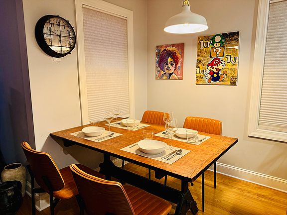 The master bedroom features a luxurious California King bed and a large closet, while the second bedroom offers a comfortable queen bed and ample closet space. There's a dining room area that doubles as an office with a chair, printer, and office supplies if desired. Additional conveniences include in-unit laundry, a dishwasher, central AC and heating controlled by a Nest thermostat, 400 Mbps high-speed internet, and two off-street parking spaces in the back. Utilities are included!