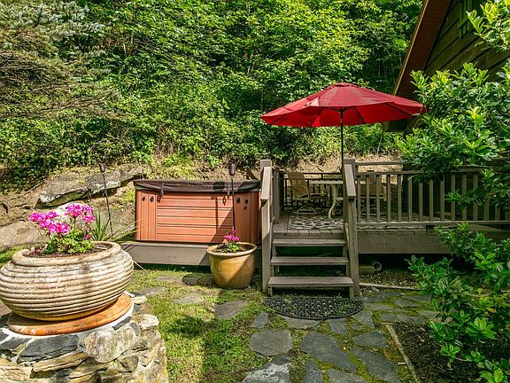 It is the perfect little cabin overlooking a very noisy stream! My husband and I are foodies and outdoor enthusiasts. We love the fact that we can be seated at a five-star restaurant in downtown Asheville in 12 minutes or Blue Mountain Pizza in Weaverville in 5 minutes. We love being so close to the French Broad River for kayaking! Before we bought it, the cabin was in a short-term rental program with an excellent record of steady AirBnB rentals! Blending nicely with her surroundings, she is truly unusual. She sits on a knoll, surrounded by 1.4 private, gated, and partially fenced acres with room for a garden or lying in the hammock. In front of the cabin is loud Flat Creek. The French Broad River is only minutes away. The interior is truly unique and instantly comfortable. Pretty pegged-pine floors flow throughout the main floor. The great room is wide open with a cathedral ceiling and large windows to both hear and see the stream. A gas log fireplace with a remote timer takes the chill off in colder months. Ponderosa Pine chandeliers and sconces both inside and out blend beautifully with the cabin design. A large kitchen includes a new 5-burner gas range, and a new large capacity washer and dryer. The main level master bedroom easily accommodates the king-sized bed. There is a guest bedroom upstairs and comfy loft den or reading room. The bath is enormous and incredibly unusual with pebble-stone flooring, hammered-copper sink, brick walls, and a multi-head shower. Just outside, is a large deck and a 6-person spa. The home has been upgraded and includes a major rebuild of the substructure. with new, cross members & support beams. More supports were added to give the cabin stability for years to come. New insulation was added plus heavy-duty vapor barrier was put in place. An out-dated heat and air handling system was removed and replaced with a new custom suspended air handler. Associated flexible ductwork was also suspended and re-routed to free-up workspace. A gas line was added to the kitchen to enable gas cooking and heavy-duty sink disposal was added. Both my husband and I are agents. We live on the coast of NC and use the cabin as a vacation home. We love it and while we do not have to sell it, our travels back to Asheville are becoming farther and farther apart. You may call us directly and we will connect you to an agent or call the agent you have been working with. Seeing the cabin is easy!