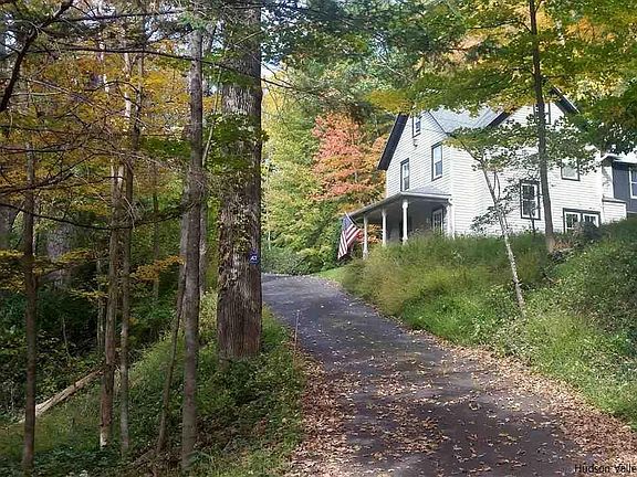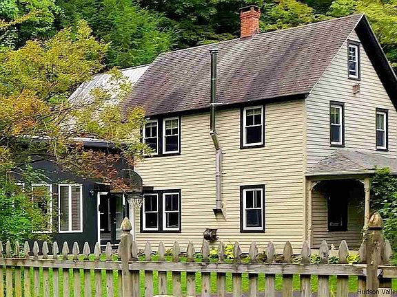LOVINGLY RESTORED 1893 VICTORIAN FARMHOUSE WITH MODERN 2011 ADDITION IN PRIME WOODSTOCK LOCATION. Cozy and delightful home with something for everyone: a standout 18x36 heated inground pool, dramatic cliffside setting with creek frontage, acres of woodlands with trails, even a seasonal mountain view. From entry foyer, walk into spacious downstairs living area with 9-foot ceilings and woodstove. A modern addition with seamed metal roof and skylights provides a huge 17x35 sun-filled cook's kitchen/dining/family room with vaulted ceilings, woodstove and radiant heat beneath reclaimed 100-year-old barnwood floors, leading to outdoor patio and pool gazebo. Sizable pantry area is adjacent to kitchen with half bath, chalkboard wall and large laundry/utility room down the hall. Upstairs are two full baths and four bedrooms. Pocket doors and wood floors throughout, rooms are open and bright. While Woodstock Village is just 7 minutes away for all it has to offer, this property is its own destination for relaxing and entertaining, for gathering with family and friends. Sit at the kitchen island, dining table or curl up on an easy chair near either woodstove and read a book. In summer, open the back doors and host a barbecue out on the covered patio, roast marshmallows at the fire pit, swim laps in the pool, wander down to the Sawkill, or take a stroll in the wooded wonderlands with swing. In season, pick grapes straight from the vine off the patio, enjoy an apple from the poolside tree. Take in creek views by day and sounds of rushing waters by night when windows are open. House has fresh sparkle and shine given $25,000 in improvements just completed, including new replacement windows in original farmhouse and exterior painting. UV light system installed for reliable water quality. Nest thermostat controls heat remotely. Retaining wall behind house was constructed in 2010, carefully designed for effective drainage diversion. Forced air ductwork facilitates addition of central air. Area downstairs offers potential for additional bedroom with full bath. This property comprises two lots: 1.75 acres with house and pool on SBL#15.4-3-26 and two wooded acres with creek frontage beyond the pool on SBL#15.4-3-2.200. Subject to Town and Board of Health approvals, explore options for adding a guest house, art studio or outbuildings. In recent years, as a successful AirBnB destination, this property has generated up to $700/night in high season and, over past six years, averaged $69,000 annually in short-term rental revenues. FEMA maps show portion of property in AE flood zone along creek frontage. House is at very high elevation relative to creek, so mortgage providers may not require flood insurance, to be determined by buyers. Current mortgage provider Ulster Savings Bank has never required flood insurance.
