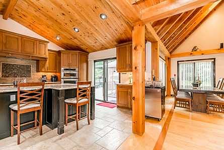 Exceptional Normerica true post & beam solidly built home on private 1.2 acre lot located on quiet cul-de-sac in North Midhurst. The private treed backyard oasis includes fenced in in-ground salt water swimming pool, hot tub large custom deck and backs onto 30 acres of shared common land. Large eat-in kitchen with centre island with granite counter, built-in oven and microwave, heated floors and walkout to rear deck. Spectacular Great room with 18' cathedral ceiling and wood burning fireplace. Large master bedroom with ensuite bath. Finished basement with separate entry newer roof, and furnace, in-ground sprinkler system, extra deep insulated/heated garage with attached workshop. and located 10 minutes to Barrie and much more! OPEN HOUSE SUN SEP 22-NOON-2P.M.