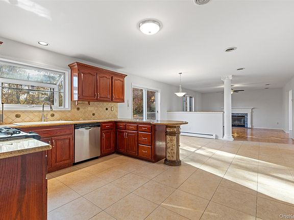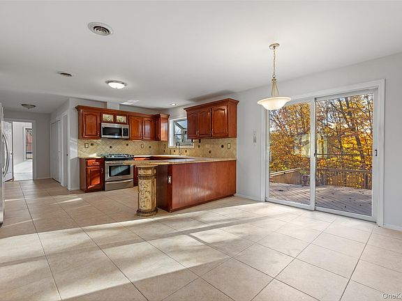 SPRAWLING BRIGHT & AIRY COLONIAL - Welcome to this spectacular five-bed, three-bath center hall colonial located in the award-winning Nanuet School District. This beautiful home offers 3,374 square feet of main living space, plus an additional 1,500 square feet in the fully finished basement, all set on a private and beautifully landscaped 0.56-acre lot. Inside, you're welcomed by a grand two-story entry foyer that sets the tone for the rest of the home. The open-concept kitchen features Italian porcelain tile flooring, custom cherry cabinetry, granite countertops, and a designer tile backsplash. Just off the kitchen, the spacious family room includes a cozy wood-burning fireplace — perfect for relaxing evenings. The expansive great room is filled with natural light from its skylight and large windows, while the banquet-sized dining room provides an ideal space for entertaining. Five large bedrooms provide ample space for family and guests, including one located on the main level—ideal for guests or a home office. All three full bathrooms feature luxury custom vanities, with one full bath on the main floor and two upstairs. Step outside to a multi-tiered deck that overlooks a private, fenced-in backyard—perfect for outdoor dining, entertaining, or simply enjoying a quiet evening. An attached three-car garage with a separate side entrance offers additional convenience and storage. Ideally located with quick access to the train station and major highways, this home is a commuter's dream with connections to NYC, New Jersey, Westchester, and Orange County.