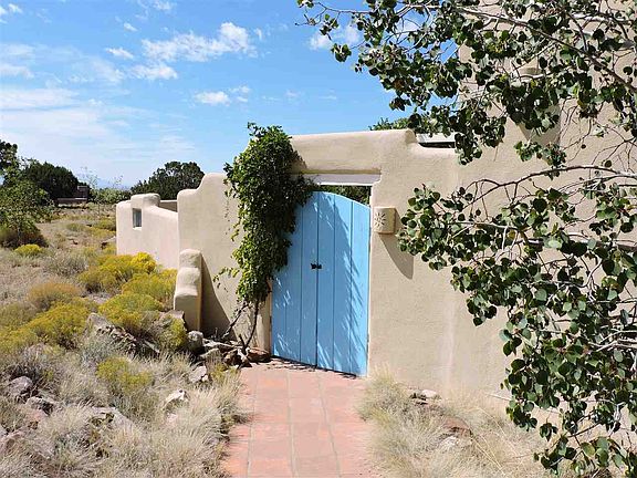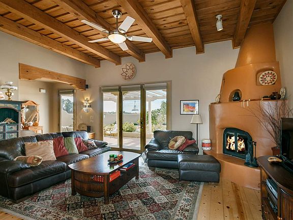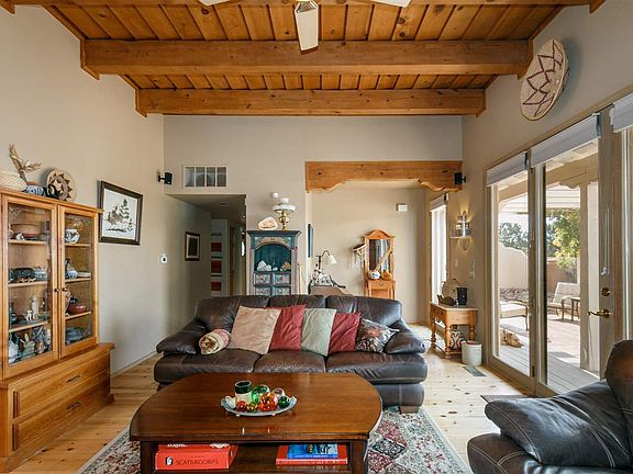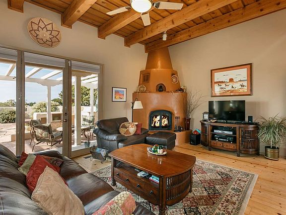 Centrally located on a high point and bordered by large greenbelt with glorious mountain views to the South, West and North. Delightful passive solar, open plan, split bedroom design includes natural gas forced air heating and a kiva fireplace which both heats and creates a cheery great room coziness. High beamed ceiling and pine wood floors add character to the living areas. The dining room opens to a private portal, patio and a dining deck for sunset entertaining. The large kitchen with island has lots of cabinetry and double ovens. Between the 2 car garage and home is a private heated office/guest area accessed from the portal. Best of all is a large detached heated studio with bathroom just waiting for your artistic talents or company overflow needs! This house is a must for your Eldorado at Santa Fe tour!