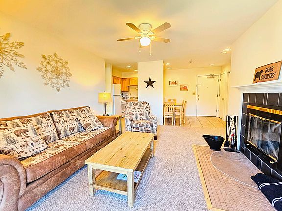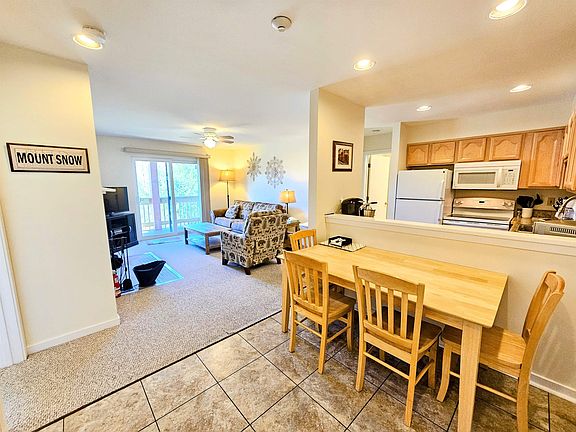 Updated 2 bedroom, 2 full bath condo located right in the main base area of Mount Snow. In fantastic condition, neat as a pin, clean and bright with lots of natural light and extra end windows. Open kitchen/living floor plan with wood burning fireplace, large breakfast bar and full sized dining table. Primary suite complete with a Mount Snow view! Located on the first floor so no stairs to enter but elevated second story view from your mountain facing deck out back. Great interior closet space and outside ski locker. Shuttle bus from your door to the drop zone which is just down the hill. Walk over to the amenities center or get in a game of tennis right out the front door. Condo association fees include all exterior maintenance and landscaping, tennis, fire wood, inside heated pool and hot tub, laundry, game room, trash, water, sewer, AND HEAT! Fantastic rental potential in a great location for four season recreation.