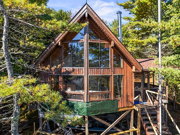 The perfect seaside getaway, never before offered, overlooks Georgetown's coveted Narrows inside McMahan and Turnip Islands. You will spend years gazing past your boats to Sheepscot Bay and the open ocean, marveling at the protection of your waterfront. This incredibly private, five acre location boasts a Lindal-Style prow home, a distinctive architectural style characterized by a large, triangular, multi-story wall of windows that peers out like the front of a ship, capturing panoramic views and bathing the interior with natural light. Incredible sunrises are the norm at this home every day! This sought-after modern A-frame-inspired design dramatically enhances the view of sky and sea here at Narrows Way -- you will feel your soul unwind the minute you enter this lovely home and gaze through the living space to sea-framed pines. After decades of enjoyment this family must let go of their cherished Maine summer home. Update the interior and complete a deck replacement to your liking. New septic system design is ready and needs to be installed within 180 days of purchase to replace the overboard discharge system. Explore winterizing or expanding this home! The ramp and float are no longer on site, but a small pier section remains for you to use.