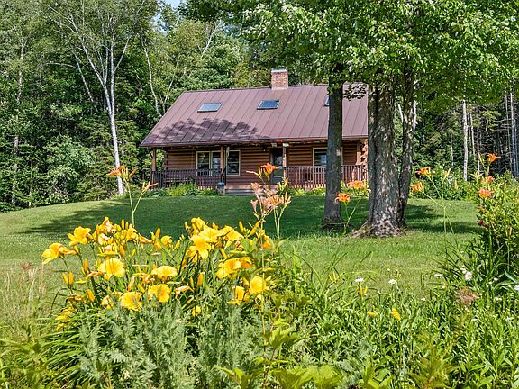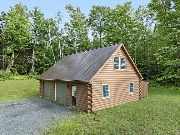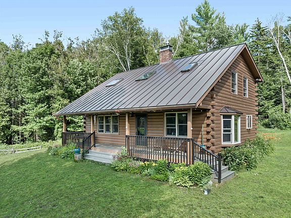 Perched in serene privacy with sweeping views of Camel's Hump, this charming log cabin offers a quintessential retreat in a picturesque setting. Step inside to discover new hardwood flooring and freshly painted interiors, complemented by updated lighting fixtures throughout. The layout includes three bedrooms and two full bathrooms - including a first floor bedroom and full bathroom option. The living room benefits from natural lighting and vaulted ceilings with access to the gracious front porch, while the kitchen has plenty of custom storage and seating with a breakfast bar adjacent to a spacious dining area. Enjoy a comfortable bonus area in the basement, perfect for recreation or additional living space. An owned solar array ensures energy efficiency, while a detached heated garage with semi-finished space above offers versatility as a home office, studio. One garage bay is currently set up for parking, the remaining oversized garage bay is being utilized as finished (heated) space but could easily be turned back into additional garage parking. Relax on the expansive front porch, where breathtaking sunsets over Camel's Hump paint the sky. With complete privacy this home combines rustic charm with modern comforts. Feel removed while only minutes from shopping and dining.