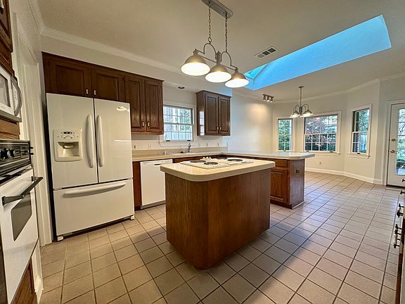 This freshly painted brick home features plenty of natural light including skylights and arched windows. Three bedrooms are located downstairs and atop the stairs you will find a bonus bedroom and half bath. One downstairs bedroom opens to an ensuite bath perfect for guests. In the private, fenced backyard, you can relax on the covered brick porch surrounded by mature landscaping. Also included: two car garage, storage room, ceiling fans, refrigerator, new carpeting, and new heating & a/c systems.