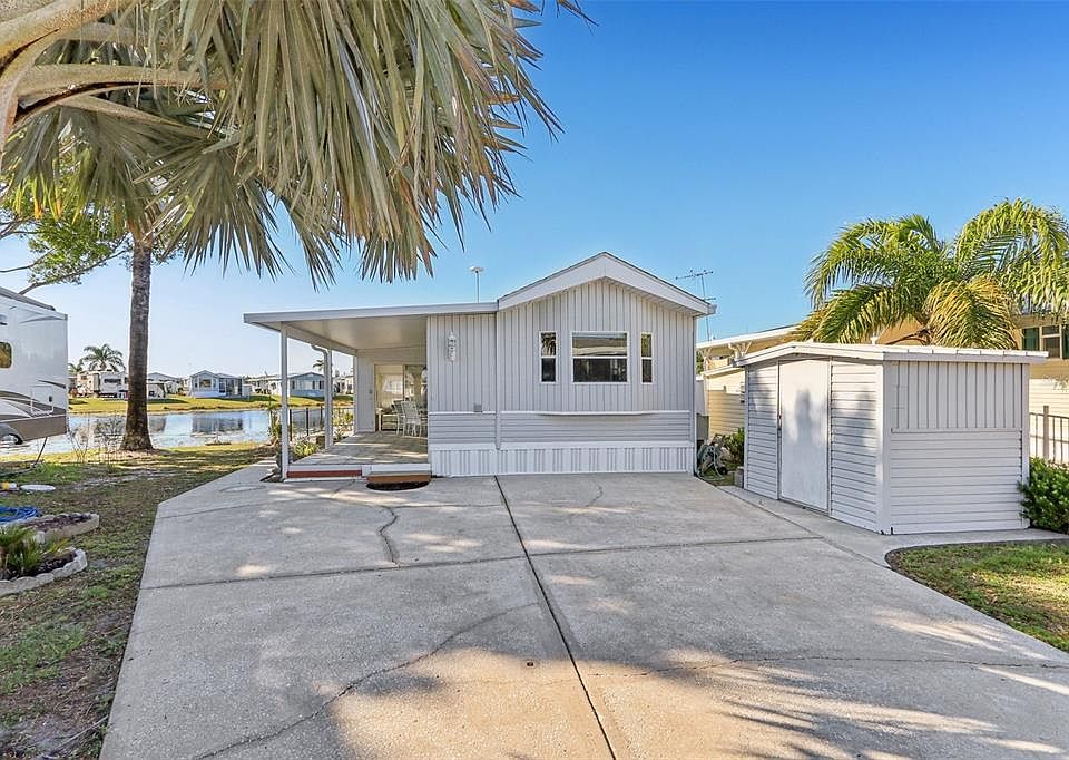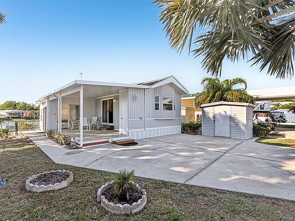 Welcome to 13 Red Quill Circle, a LAKEFRONT home in the beautiful gated community of Saddlebag Lake Resort! This community is not a share or lot rent, ownership includes a DEEDED piece of property! This waterfront home is on circle street, meaning it is not a main road, leading to quieter living. There is no shortage of parking available, with a large parking pad that could accommodate 4 vehicles! Out front you will find a storage shed, and you can park your golf cart if you are not there year-round on the side of the home. The home has plenty of outdoor living space, with a lovely covered patio with a stunning view of the lake. There is also a laundry closet with a stackable washer and dryer out on the patio. Inside the home, you’ll find an open living space, with the living and dining spaces and kitchen flowing together. There is a lovely bay window in the kitchen to allow for additional natural light. The bathroom features a tub/shower combo, and the cathedral-style ceilings make the home feel much more open. The primary bedroom is in the back of the home, with a large built-in closet, and views of the lake. There is an additional second bedroom / Florida room with two sets of sliding glass doors, allowing easy access outside. The southern orientation of the home means spectacular sunrises and sunsets from your backyard! The home is being sold fully furnished and turnkey. Saddlebag Lake Resort is an amenity-rich oasis in Central Florida. Not only is the community gated, but the main feature of the park is Saddlebag Lake, with a boat ramp and pier. Some of the top amenities include: pickleball courts; fitness center; swimming pool; and an open-air beach house. You can do as many or as few activities as you want to here, but no matter what you will never get bored living here! Schedule your showing TODAY!