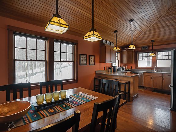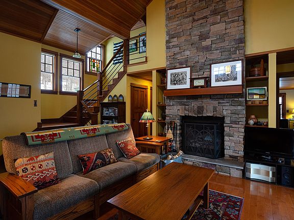 Spectacular Arts and Crafts Home built in 2006 with sweeping ridgeline winter views on an expansive corner lot overlooking common land in Chimney Hill. Surrounded by an outdoor playground of amenities, this home has been meticulously crafted and maintained. Arrive on a town road to a wonderful cedar sided house with attached 2 car garage surrounded by perennial gardens, stone walkways and stone steps. Upon entering the great room you'll be greeted with a soaring stone fireplace and Douglas Fir Beadboard cathedral ceilings, maple hardwood floors, natural woodwork and plenty of light. Enjoy cooking and entertaining in the open living space kitchen/dining room with maple cabinetry, silestone countertops and stainless steel appliances. As you tour the main floor, appreciate the convenience of the master bedroom and bath, guest bedroom and bath and laundry all on one level. Up the gorgeous maple staircase is another guest bedroom and bath. Windows throughout are custom fitted with Hunter Douglas blinds. House is sited to ensure maximum sunlight and views. Clerestory windows flood living room and upstairs bedroom with natural light. Sit among the treetops on the 35' Veranda enjoying the southern and western exposures. Envision the many potential uses in the full unfinished walkout basement. Conveniently located across from the Haystack trailhead and close to the community clubhouse. Skating, sledding, snowmobiling, hiking, snowshoeing and pickleball are all easily enjoyed.