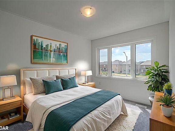 BRAND NEW END UNIT TOWNHOME PRICED TO SELL WITH QUICK CLOSING AVAILABLE! Get ready to move into this stunning, brand-new townhome, part of the highly desirable Ventura South Townhome Collection, featuring 1,650 sq ft of beautifully designed living space with 3 bedrooms and 3 bathrooms. Priced to sell and move-in ready with a quick closing available, this home offers unbeatable value, and a 7-year Tarion Warranty. Perfectly positioned near Highway 400, South Barrie GO Station, scenic walking and cycling trails, top-rated schools, and shopping. Enjoy quick access to Friday Harbour Resort, golf courses, and endless recreational facilities right at your doorstep! Curb appeal delights with a charming covered front porch and a front door with a transom window for additional natural light. With no sidewalk in front, you'll enjoy parking for 2 vehicles in the driveway. Step inside to find upgraded high-quality laminate and tile flooring throughout the main floor, laundry room, and bathrooms. The open-concept kitchen boasts rich-toned cabinetry, a sleek stainless steel chimney style range hood, electric range, dishwasher, French style door refrigerator and a spacious island with breakfast bar seating for 5. The bright great room leads directly to your backyard through sliding glass doors - perfect for indoor-outdoor entertaining. Upstairs, plush premium broadloom adds comfort to the bedrooms, upper hall, and stairs. The primary bedroom is a private retreat with a 3-piece ensuite and 2 walk-in closets. A convenient main-floor laundry room includes overhead cabinets and a built-in clothing rod for added convenience. You won't want to miss out on this gorgeous, brand-new townhome at an unbeatable price!
