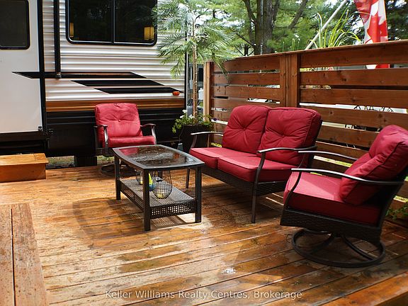 2023 Wildwood Lodge 42QBQ with extended warranty until 2029. This turn-key retreat is ready to enjoy, offering comfortable accommodations for up to 10 guests. The bright, open layout features a cozy fireplace, smart TV, accent lighting, and flexible seating and dining configurations with storage underneath. The farmhouse-style kitchen includes a residential fridge, pantry, and ample cabinetry. The spacious front bedroom offers excellent closet and drawer space, while the rear bunkhouse is designed for versatility set up with three bunks and a couch, or three bunks and a queen-sized bed. A 50 LED TV creates the perfect spot for gaming or movie nights, and the space could also be adapted as a home office or hobby area. The back bedroom includes its own powder room with direct deck access. Outdoor living is exceptional with a freshly sealed multi-level deck, screened gazebo with ceiling fan and side curtains, outdoor kitchen, bar top with stools, shed with fridge, BBQ, outdoor furniture, two kayaks, lawn mower, bicycles, and more all included. The park amenities are equally impressive with multiple playgrounds (including one behind the site), two indoor pools with hot tubs, a beach area with inflatables, dock space, boat rentals, general store, walking trails, outdoor games, and close proximity to the Black Horse Golf Course. This property combines comfort, flexibility, and unbeatable amenities ready to be enjoyed from day one