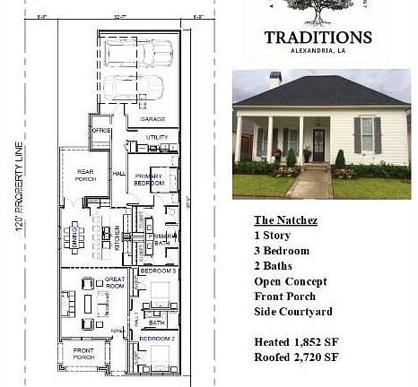 Discover The Natchez in Traditions on the Bayou, a premier 75-acre gated Traditional Neighborhood Development in central Louisiana. Designed for walkability and connection, this vibrant community offers sidewalks, parks, trails, a community pool, pavilion, and future retail, dining, and office spaces. The Natchez is a stunning 1-story home featuring an open-concept design, a welcoming front porch, and a private side courtyard. It includes 3 bedrooms and 2 baths, with 2,006 heated square feet (2,720 SF under roof) and a floor plan that combines comfort and modern living. Residents enjoy exclusive amenities and community events like farmers' markets, concerts, and holiday gatherings.