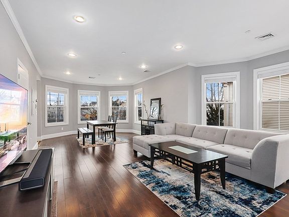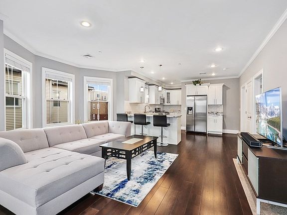 Masterfully constructed in 2015, this elegant residence has it all! A premier neighborhood walking distance to upcoming Green Line, Orange Line & multiple bus station routes at Sullivan Sq, Assembly Row & Union Square. Superb single level living w/striking architectural detail & sunlight streaming in from every window; custom designer kitchen featuring fine crafted cabinetry, expansive peninsula with quartz counters & ambient lighting; open concept dining room/living room with high ceiling; 2 primary en suites with outstanding baths & spacious closets & best of all an enclosed sunroom with magnificent Boston skyline view that is perfect as home gym or office. Features of this home include 2 car parking; high-efficiency heating & cooling system controlled by a Nest smart thermostat; LED lighting; in-unit laundry & private basement storage. Association is comprised of 3 units that are 100% owner-occupied, self-managed, has low fee & common area gazebo with outdoor seating. Pets welcome.