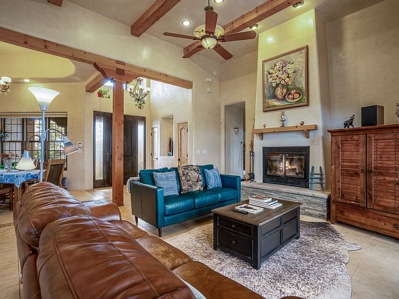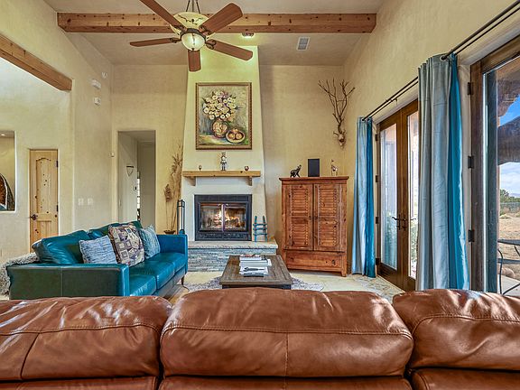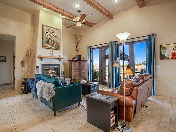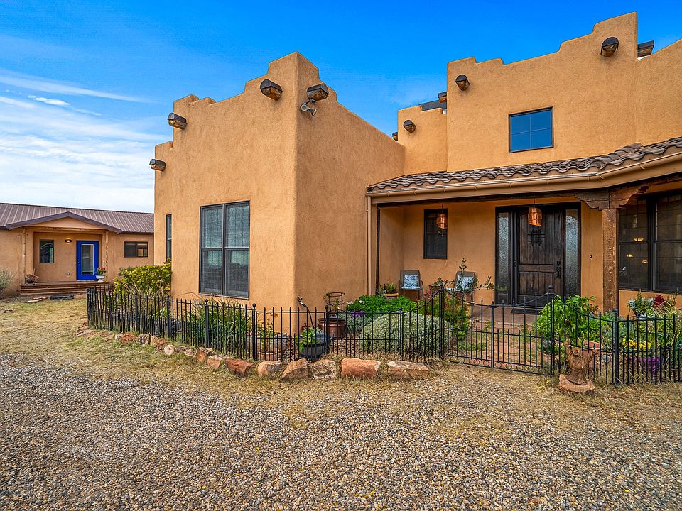 Discover a peaceful retreat nestled on over an acre of land offering stunning mountain views and sunsets, as well as views of City lights. This home features high ceilings with wood beams and a grand fireplace. Abundant natural light fills the spacious interior, highlighting the timeless design and open-concept floorplan. Two sets of French doors in the living room intertwine the indoor and outdoor spaces. The primary suite offers a luxurious respite with a large walk-in closet. While two additional bedrooms and a bathroom provide comfortable accommodations for guests and family. A well-equipped laundry has plenty of room for household tasks. The finished two-car garage provides ample parking and lots of storage. A detached studio offers a versatile workspace, private getaway, or potential for rental income. The large room in the studio, equipped with a sprung floor, is ideal for exercise or creative pursuits. The kitchenette and full bathroom add functionality, while a separate room functions as a bedroom or private office. This expansive property, spanning 1.43 acres, offers the perfect blend of indoor and outdoor living, and features numerous energy-efficient elements including grid-tied solar panels. Enjoy the serene setting while taking advantage of the modern features and layout. Located in the Traditional Historic Community of Agua Fría Village in Santa Fe County yet minutes from downtown and City of Santa Fe amenities.