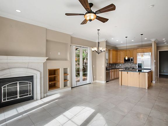 Stylish backsplashCozy gas fireplaceWine fridgeGranite countertops