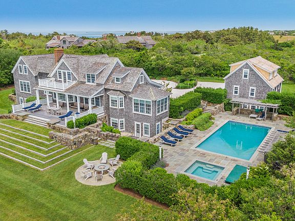 Welcome to this stunning pond front home with breathtaking ocean views located in a private and exclusive Cliff Road neighborhood. Located on a two acre lot, this home offers the ultimate serene setting to unwind and enjoy the beautiful surroundings. This custom built home boasts high ceilings, stately millwork, and coffered ceilings, all masterfully designed by Botticelli & Pohl Architects. Featuring a five bedroom and six bathroom main house encompassing three finished levels of living including hardwood floors, cozy fireplaces, and a fully finished walkout lower level. Step outside to enjoy the swimming pool, hot tub, fire pit, and outdoor space with panoramic sunset vistas. The detached two car garage includes two guest suites, two full bathrooms with two galley kitchenettes. Situated near the Cliff Road Bike Path with access to a shared tennis court, this home is perfect for those who enjoy the beauty of the outdoors with close proximity to Nantucket town. Don't miss out on your chance to own this slice of Nantucket paradise.