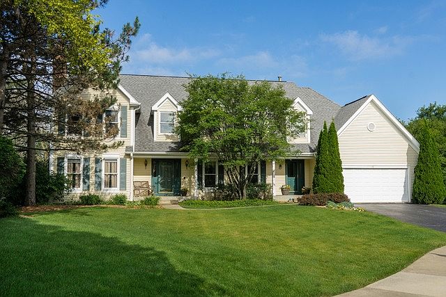 Wonderful Bedford Model with 3588 sq ft on Cul-de-sac with largest, private back yard in Stone Fence! Features include: inviting 2 story foyer w/hardwood, spacious kitchen w/cherry cabinets, island/breakfast bar and spacious eating area. Family room w/fireplace and wet bar, living room w/fireplace. First floor office! Huge master suite w/sitting room & built-in cabinets, vaulted ceilings and huge walk-in closet. Finished basement w/built-in cabinets. Walk to train! Nationally top ranked Stevenson High School.