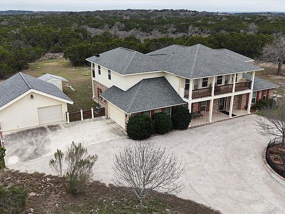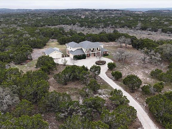 Welcome to your own slice of Hill Country paradise in Lost Springs Ranch, a gated 311-acre community with only 77 estate-sized lots! This rare offering includes a meticulously maintained custom-built 2-story Tilson Home that sits on 6 acres PLUS an adjacent 6-acre undeveloped parcel—giving you 12 total acres of peaceful, scenic land with endless potential. Tucked back from the main road, these 2 properties offer unmatched privacy, tranquility, and a true respite from the concrete jungle. Conveniently located, you’re approximately 20 minutes to San Marcos, 1 hour to San Antonio and 50 minutes to Austin-Bergstrom Airport —perfectly balancing peaceful country living with easy access to city conveniences. The main home features 3 spacious bedrooms, 2.5 bathrooms, and a versatile layout. While the primary suite is upstairs, the downstairs bedroom can easily serve as a second primary. A secondary upstairs bedroom is currently a music room or can be a flex room of your choice. Expansive living areas upstairs and down showcase solid oak custom built-ins perfect for your treasured keepsakes or books while high ceilings, crown molding create an elegant, welcoming atmosphere. Accessibility is enhanced with a removable Acorn Stairlift. The kitchen offers plenty of storage, a breakfast bar, and morning sunshine. Outdoors, enjoy multiple balconies, and areas to take in serene Hill Country views. Beyond the main residence, this property shines with a private guest house (with full bath, living area, and optional kitchenette), a workshop, exercise room, stocked storage shed, & 3-car garage. Horses and livestock are welcome, and equestrian enthusiasts will love the direct trail access. Community amenities include a private Blanco River Bluff park, pool, pavilion, fire pit, hiking trails & a peaceful pond and you're just minutes from charming Wimberley Square with its retail and restaurants. What an extraordinary opportunity to have your very own Hill Country retreat.