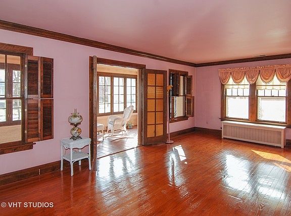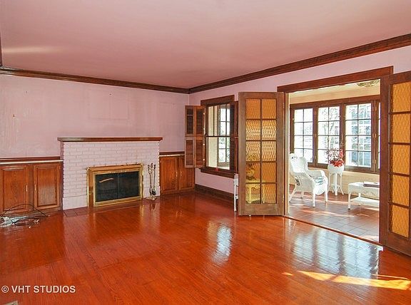 Elegant brick 4 BR, 3.5 BA Prairie Style home situated on beautiful landscaped lot, located only one block from Riverside's Historic downtown, Metra Station & award winning schools. Enter through the lovely foyer with open stairwell to the spacious living room with wood burning fireplace, & custom built in book cases. French doors open to the relaxing sun room surrounded by windows on all sides. The charming formal dining room with wainscoting leads to the bright kitchen with white cabinets and center island with seating.The second story features 3 large bedrooms including the Master with adjoining bathroom. A charming built in linen closet and second full bath complete the second floor. The ample finished basement with ceramic flooring offers additional recreational space and a 4th bedroom with attached full bath, plus laundry and storage rooms. Other features include hardwood floors, gorgeous crown molding, oak hardwood floors and 3 car garage. This property is being sold AS IS.