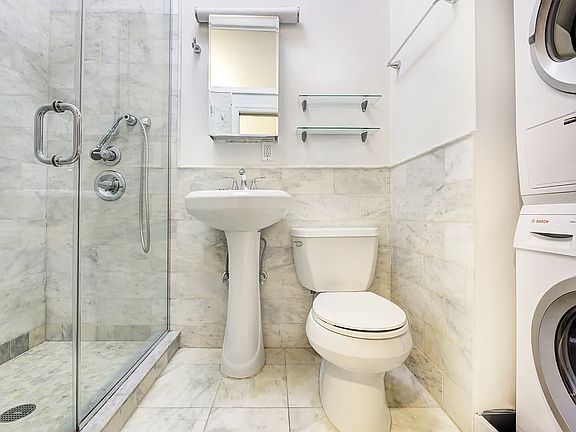 Both bedrooms can fit a queen bed along with a dresser or desk. The marble-tiled bathroom includes a shower, toilet, pedestal sink with mirrored medicine cabinet, and in-unit washer and dryer.
