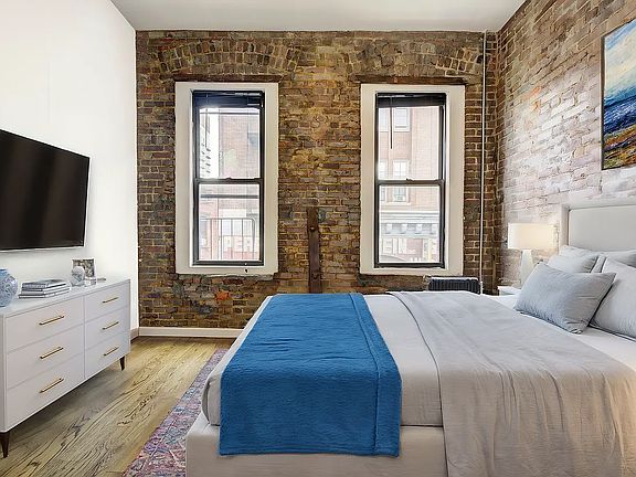 Exposed brick wallsIn-unit washer and dryerStainless steel electric stovePedestal sinkMarble-tiled bathroomRenovated kitchenCaesar stone countertops