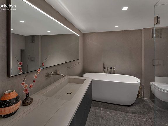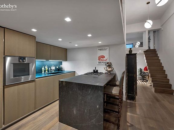 Every detail was thoughtfully executed from the fumed oak flooring throughout to the chef's kitchen outfitted with Gaggenau and Miele appliances, sleek black quartzite countertops, and custom cabinetry. An in-unit washer dryer is included.