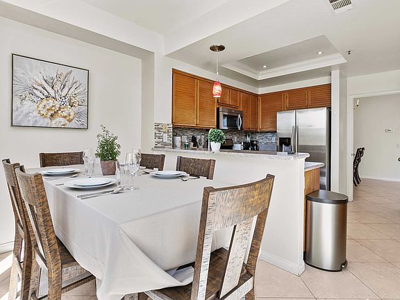 The kitchen at Cartier Cove Haven is a culinary enthusiast's dream. It is equipped with top-of-the-line appliances, sleek granite countertops, and ample cabinet space. Whether you're preparing a morning coffee or a gourmet meal, this kitchen makes every cooking experience a pleasure. Adjacent to the kitchen, the dining area provides a welcoming space for meals and gatherings, overlooking the serene outdoor landscape.