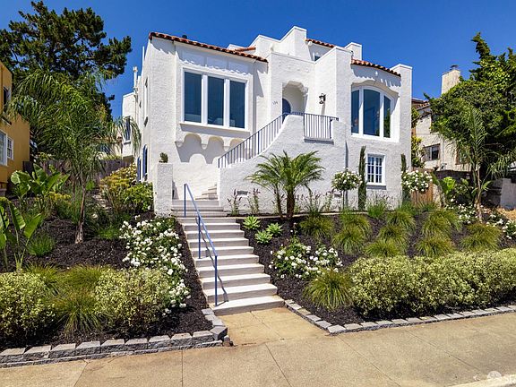 Magnificent French Mediterranean view home tucked away on prime block, close to Stonestown Galleria & Muni transportation! A beautiful landscaped garden entrance leads to an arched portico & into an impressive foyer w/center hall floor plan. Remarkable formal living rm w/dramatic barrel ceiling & intricate plaster molding ornamentation boasts a majestic fireplace w/classic mantel & period tile surround, splendid arched alcoves, attractive wall sconces, large picture window & gleaming hardwood floors. Banquet-size formal dining rm w/huge arched window & stylish Louis Poulsen light fixture! Tastefully updated kitchen w/fabulous light-filled breakfast rm & direct access to the backyard showcases all stainless-steel appliances, quartz counters, painted wood cabinets & convenient pantry. A gracious split-level staircase leads to a spacious landing w/linen closet, 2 good-size BR's & a luxe remodeled marble BA. A charming staircase w/skylight ascends to the handsome master suite atop which features a first-class Heath tile bath & sweeping views from the Olympic Club to the Pacific Ocean. Terrific family rm w/built-in media cabinet & private entrance, big crafts rm or gym, laundry area w/sink, wine rm. Wonderful terraced landscaped backyard w/paver patio, bistro lights & giant side yard!