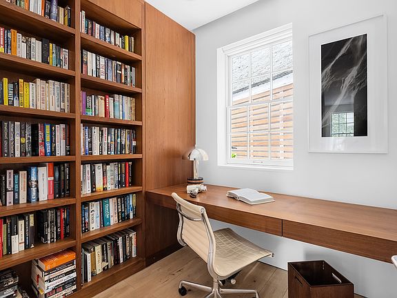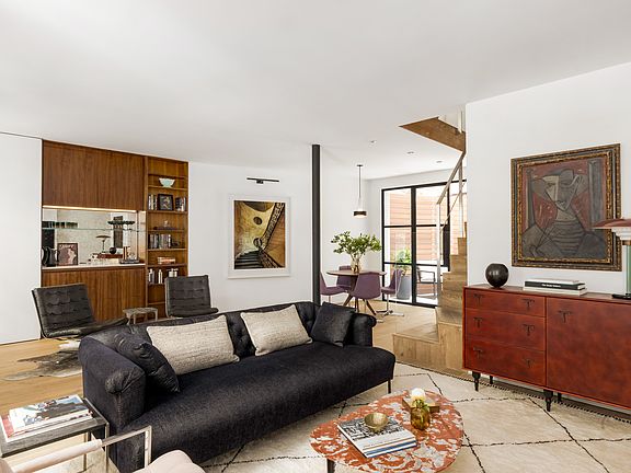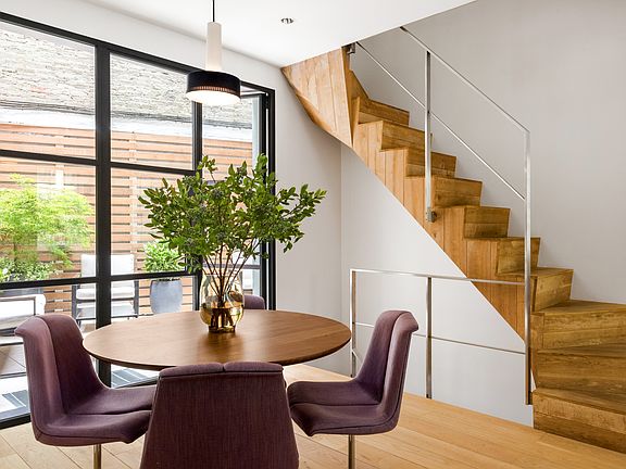 Enter via the parlor floor to an open concept, full-width great room, offering multiple seating areas, a wood-burning fireplace, a walnut bar with antique mirrors and minimalist lighting, and wide-plank hardwood flooring. Steel and glass casement doors open onto the private garden, creating a rare level of connection between indoor and outdoor space not typically found in many townhouses. Cleverly tucked away is a private walnut-wrapped office; a space of solitude yet immediately accessible to the living space. The custom oak and steel stairs connecting all floors will lead you down to the garden level, flanked by the home's minimalist kitchen with Calacatta marble counters and Miele appliances as well as a service area with powder room and laundry facilities. The formal dining room is also full-width, with stone slab flooring echoing the detail work on the adjacent fireplace. A secondary access point makes day-to-day access to this level seamless.