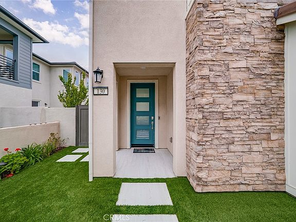 Step through the private garden gate to a beautifully designed low-maintenance yard with artificial turf and one of the LARGEST BACKYARDS in Great Park. Ideal for entertaining, the outdoor space features a built-in fireplace, tiled patio flooring, and expansive stacking glass doors that create seamless indoor/outdoor living.