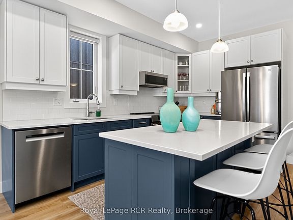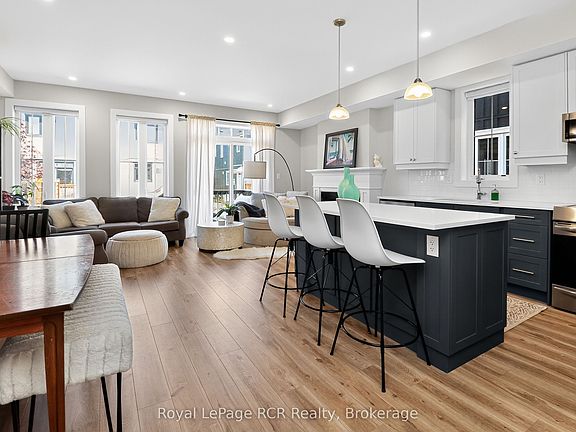 Welcome to this stylish 3-bedroom, 3.5-bath semi in the sought-after Windfall community! Built in 2022 with over $22K in builder upgrades, this Mowet model home seamlessly blends luxury and comfort. The main floor showcases a gourmet kitchen with high-end stainless steel appliances, a sleek two-tone design, quartz countertops, and a large sit-up island. The light-filled open-concept dining and living rooms feature a cozy gas fireplace and a walkout to the backyard, perfect for both everyday living and entertaining. Upstairs, the spacious primary suite offers a walk-in closet and a spa-like en-suite with double sinks, a glass shower, and a soaker tub. Two additional bedrooms, a full bath, and a convenient upper-level laundry room complete the second floor. The fully finished lower level offers an additional 3-piece bath and even more living space with a versatile family room with plenty of windows for natural light. No sidewalk on this side of the street offers even more room for parking. As part of Windfall, you'll have access to The Shed, an exclusive amenity centre with a community hall, heated outdoor spa-like pools, a gym, and a sauna. Steps to scenic trails, ski lifts at Blue Mountain, and minutes to both the Village and downtown Collingwood. This home truly has it all: luxury finishes, thoughtful design, and an unbeatable location!