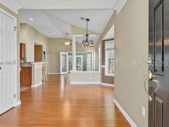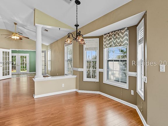 Charming 2BR/2BA cottage located on a quiet street in the popular Pinecrest community of Bluffton. This single-story home features an open floorplan with vaulted ceilings in the living, dining, and kitchen areas, creating an open and airy feel. The spacious kitchen offers excellent storage and prep space, ideal for everyday living or entertaining. A fully enclosed Carolina Room is perfect for a sitting room, office, or hobby area. The backyard offers wooded privacy and a beautiful specimen crepe myrtle tree that shades the rear patio, an inviting spot to relax outdoors.Additional highlights include a 1-car garage and recent updates: roof in 2023, HVAC in 2022, and water heater in 2022, brand new carpet in 2025. Pinecrest is a golf cart-friendly community offering top-tier amenities including a resort-style pool, tennis and pickleball courts, bocce, fitness center, and playground. Optional golf club membership is also available. Conveniently located near Bluffton schools, shopping, dining, and entertainment, this home blends comfort, value, and location in one of the Lowcountry's most desirable neighborhoods. Approx heated sq ft includes the Carolina Room, which is not currently vented but can be easily modified to add HVAC.