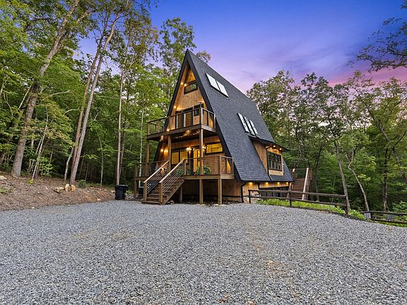Introducing the Lux Lodge, a modern A-Frame built to impress. This striking retreat features five bedrooms, three bathrooms, and an open-concept living space anchored by a chef's kitchen with high-end appliances. A built-in coffee and cocktail bar, seating for eight, and a large granite island make it perfect for hosting. Floor-to-ceiling windows flood the home with natural light and offer a treehouse-like vibe throughout. Outside, gather around the rock fire pit or take the party to the screened porch ideal for outdoor dining, movie nights, or games, rain or shine. Tucked behind a private gate and bordering protected USFS land, the property offers immediate access to hiking trails, creeks, and waterfalls. Lake Blue Ridge is just a 10 minutes walk, and the Toccoa River is a quick 3-mile trip for fishing or floating from Sandy Bottoms launch. The Lux Lodge is a thriving short-term rental, offering both a private escape and a turnkey investment opportunity. Sold fully furnished and thoughtfully designed throughout, this A-frame delivers a unique blend of modern comfort, privacy, and natural beauty. Dive into the mountain experience and make this one yours today.