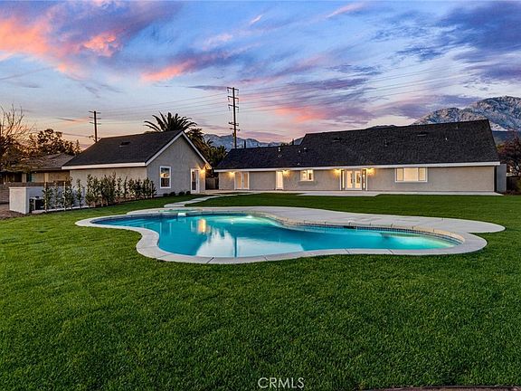 Welcome Home! This north Upland property has an outstanding open concept floor plan featuring a stunning kitchen with seating island, new cabinetry, high end appliances including microwave drawer and matching refrigerator, stately dining room overlooking the mountain range and a living room with adjacent patio access. For larger gatherings, movie and game nights, enjoy a the den with stone fireplace, vaulted beamed ceilings, wet bar with minifridge. Master suite has been redesigned and upgraded with a walk in closet, large tiled walk in shower, private commode, dual vanity with accent tile wall. Two additional bathrooms have been remodeled to serve 3 additional bedrooms. The list of upgrades includes all new flooring including engineered white oak, luxury plumbing and lighting fixtures, glass shower doors, dual paned windows, French doors, expansive concrete patio, new refinished Pebbletec pool/spa, all new landscape w/sprinkler system, front viewing patio, finished oversized 3-car garage with epoxy floors, Zline Autograph appliances. This property is dream home material. Info deemed reliable, buyer to verify.