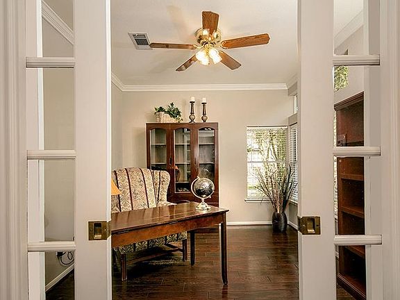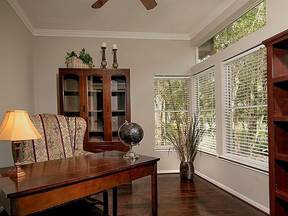 Outstanding LifeForms home that backs to a lush greenbelt in Indian Springs! Covered front porch, crushed granite walkway and easy maintenance landscaping provides a park-like setting. Energy efficient with 16 SEER A/C, interior and exterior walls were painted with radiant barrier heat paint, new carpet and hardwood floors. Spacious kitchen with stainless steel appliances and glass front cabinets opens to sunny breakfast room; formal dining with chair rail; den has gas log fireplace; private study with crown moulding, plenty of windows and French pocket doors; two bedrooms and master retreat up with vaulted ceiling and sunroom; two car garage with epoxy floor; fenced backyard features covered patio, 3 wood decks and pergola with no rear neighbors, ensuring privacy. Never flooded! Close to the Mitchell Nature Preserve, shopping and restaurants!