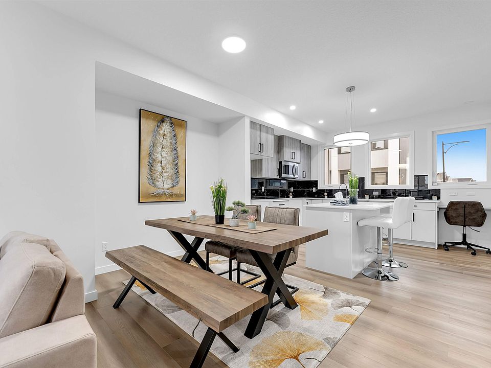 Modern 1,563 sq. ft. townhome in the sought-after community of Erin Ridge, St. Albert. This home offers 3 bedrooms, 2.5 bathrooms, and a versatile ground-floor flex room ideal for an office, gym, or playroom. The open-concept main floor features 9 ft ceilings, large windows, and a stylish kitchen with quartz countertops, stainless steel appliances, a walk-in pantry, and a spacious island. Enjoy a private balcony and an oversized double attached garage. Upstairs includes convenient laundry, two bedrooms, and a spacious primary suite with a walk-in closet and luxury ensuite. Located near trails, parks, top-rated schools, and major amenities including Costco. Alberta New Home Warranty included. Perfect for families or investors seeking modern living and long-term value.