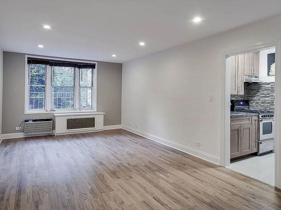 The apartment features high ceilings, three windows, and hardwood floors that highlight the timeless character of the space. A thoughtfully designed layout provides both comfort and functionality, with well-proportioned rooms and generous closet space.