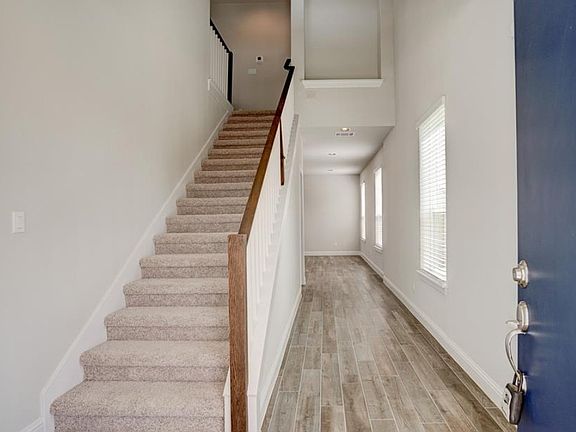 - Elegant wood-grain luxury flooring paired with plush carpet