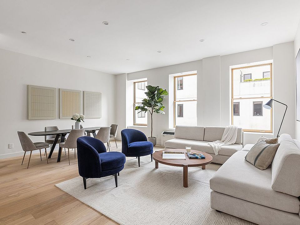 Upon entering the primary entertaining level on the sixth floor, the generous foyer leads to a spacious living area that accommodates a designated dining area and ample seating in the living room. The kitchen, thoughtfully redesigned by Copenhagen-based Norm Architects in collaboration with Reform, features generous storage and the latest high-end Fisher & Paykel appliances, two disk drawer dishwashers, a 36-inch gas top stove, and double ovens. An oversized island complements the grand entertaining space and provides separation from the kitchen and large living and dining room. A comfortable home office, library, or legal third bedroom with an en-suite powder room adds to the level's versatility, making it an excellent choice for seclusion while working or accommodating guests.