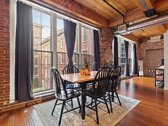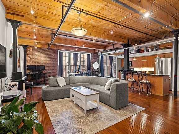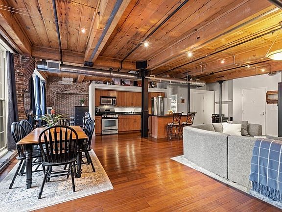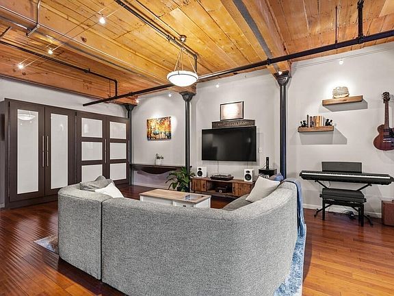 This beautiful downtown LOFT is open-concept living at its best. When you enter you immediately feel its warmth. The gleaming hardwood floors, the soaring ceilings and the original brick walls coupled with the expansive wall of windows, lets you know that you've arrived HOME. The kitchen has new stainless appliances, granite counters and a sizable island for easy entertaining. The bedroom is behind the tall wall and is large, spanning the length of the condo. There is also a drop-down Murphy bed on the other side of the space, offering private sleeping for a guest or roommate. The bath has recently been painted and includes a washer/dryer. There is ample room for separating the areas into living, dining and an office space, while still leaving plenty of open space in this almost 1100 square foot unit. The windows look down into a beautiful shared courtyard. The building also has a shared rooftop deck overlooking the river, an exercise room, a game-room and a beautiful lounge.