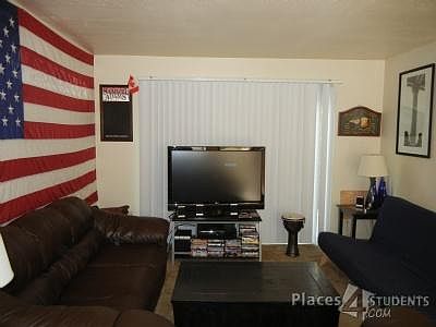 * Living room with hardwood floor. Large kitchen with granite counter top, stove, refrigerator, microwave, and dishwasher. Coin laundry inside the house