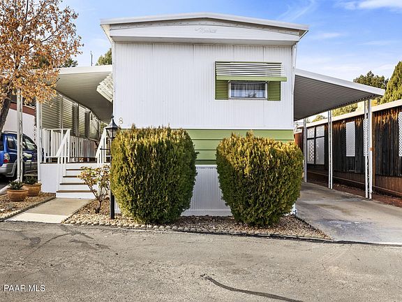 Newly remodeled home with lots of character! New Flooring Throughout, Newly Remodeled Bathroom with spacious step in shower. Upgrades in kitchen including new shelving and window treatments. New interior and newer exterior paint. Great location near the downtown Prescott Courthouse, close to shopping, restaurants, and medical. Attached car port has room for 2 vehicles in tandem. The covered front trex deck provides the perfect place to enjoy the weather! Lot rent is $425 per month and includes trash fees. Buyers must be approved by the Park Manager and 55+.