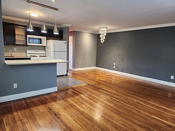Stunning Briar Hall large corner Unit 1 bedroom Condo with King Size bedroom (11x15) with NYC views from window and double closet. Tastefully updated 7-10 years ago with exquisite ceramic bath with custom fixtures and glass inlays. Gleaming Hardwoods refinished, crown molding, recessed lights. Long Entry hall into Open Floor plan living room (11x19) Gallery kitchen (8 x10) Dining area (9x9) Laundry & storage in basement. 24 hr. monitored Secure entry foyer. Elevator building. Includes heat & hot water. just pay electric & gas. NYC bus immediately outside front door & train station (with access to NYC) 2 blocks away. Steps to downtown restaurants, nightlife, shopping and Met life Stadium. Laundry & storage in lower level. Nothing to do, just unpack! No parking included; however, ample street parking is available. No smoking. No pets. 1 year lease minimum.