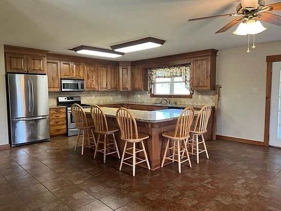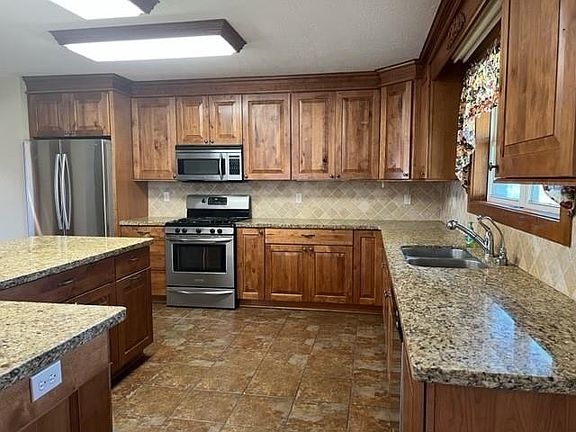 - Description: large L-shaped island with seating, granite, stainless appliances
