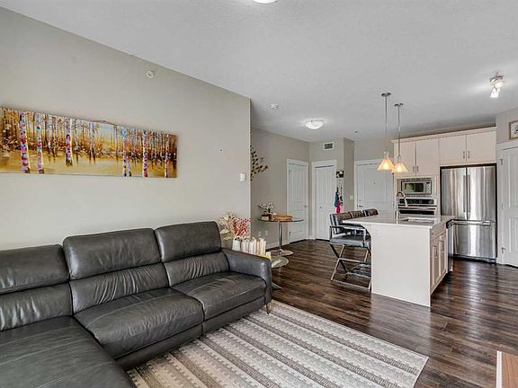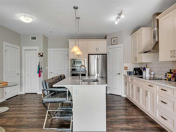 Top floor, maintenance-free living awaits in this highly sought after lake community offering year round activities and exceptional lifestyle opportunities. Modern finishes and grand 9’ ceilings enhance the open floor plan with durable vinyl plank flooring uniting each space. Culinary adventures are inspired in the beautiful kitchen featuring granite countertops, stainless steel appliances, timeless subway tile, a centre island to casually gather and a pantry for extra storage. Entertain friends in the adjacent dining area or unwind in the inviting living room that flows seamlessly to the balcony through a patio slider. Enjoy indoor and outdoor living with a covered south facing balcony that includes a gas line for easy barbeque hosting while soaking up the sunshine. Air conditioning ensures comfort throughout the seasons. Retreat to the primary bedroom complete with a private ensuite boasting dual sinks and an oversized shower. A second bedroom is thoughtfully placed on the other side of the unit along with a 4pc bathroom providing ultimate privacy. In-suite laundry adds everyday convenience. Titled underground parking and an assigned storage locker further elevate the value of this well managed building. Location is unmatched with Auburn Station commercial amenities, transit, Prince of Peace School and Auburn Bay Dog Park all within walking distance. Seton’s shops, restaurants, YMCA and the South Health Campus are a quick drive away. Best of all, residents enjoy access to Auburn Lake with swimming, boating, fishing, skating and community events creating a vibrant year round lifestyle. This top floor home combines modern comfort, functional design and the unmatched lifestyle of Auburn Bay!