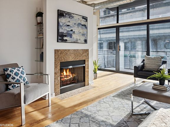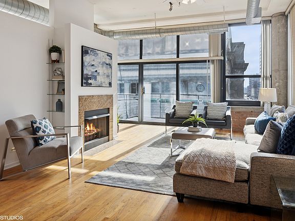 Beautiful renovation of this S/W corner home at popular Metropolitan Place, located in the West Loop. 2 bed/2 bath condo has an open concept floor plan featuring 12' soaring high ceilings, exposed brick, concrete columns, gas fireplace, hardwood floors, sunny views from 75' ft. of oversized windows, and a private balcony. The updated kitchen features granite countertops, cherry cabinets, stainless steel appliances, and a large island with room for seating. The primary bedroom with south-facing windows, a huge walk-in closet, an en-suite bath with a walk-in shower, glass doors, & double bowl sinks. The large second bedroom is generously sized with an updated full bath across the hall. In-unit laundry room with SXS washer/dryer. The building has 24-hour door staff, an on-site manager, a fitness center, & a courtyard/sundeck. Walking distance to everything the Loop/West Loop has to offer. Close to restaurants, nightlife, Ogilvie & Union Station, The Blue Line, the expressway, & much more! Investor and pet-friendly building. Exterior storage cage #B-60 is included. Heated garage parking space #A-144 additional $35,000.