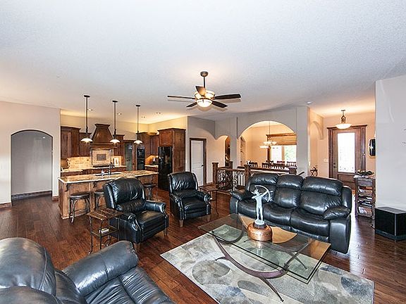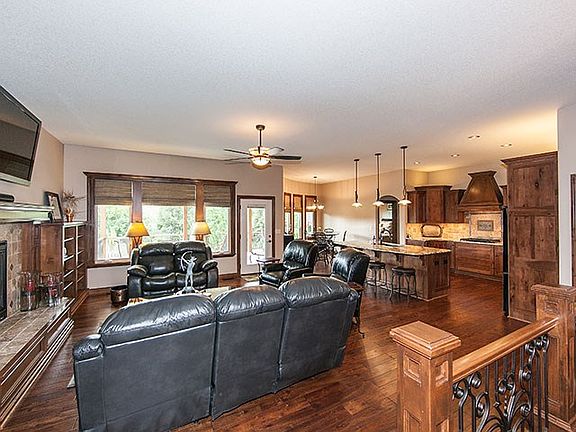 Stunning custom built ranch situated on an extensively landscaped corner cul-de-sac lot complete with a car lover's dream oversized 4 car attached garage (finished and freshly painted), hand-scraped hardwood floors, water softener, two sump pumps, custom iron work throughout (including deck), great open floor plan for easy holiday entertaining, warm and inviting living room with gas fireplace with tile surround, built-in bookcases, large windows overlooking the water with custom shades, exquisite kitchen with upgraded granite counter tops, oversized island with breakfast bar, walk-in pantry, hickory cabinetry, tile backsplash, under and over cabinet lighting, and informal dining area with chandelier and large windows overlooking the backyard and water. Enjoy peaceful nights in this serene master suite complete with dramatic two-tiered trayed ceiling with cove lighting for added ambience, ceiling fan, door to the deck, and spa-like master bathroom with tile flooring, soaker tub, oversized tile shower, upgraded granite vanity with his and her sinks, linen closet, and large walk-in closet with 3 levels of hanging rods and access to the laundry room for added convenience. Entertain with ease in this exceptional finished basement complete with family room with carpeting recessed lighting and gas fireplace with brick and stone surround, game room with stamped concrete flooring, spectacular wet bar with upgraded granite counter tops, microwave nook, and wine/snack room with custom iron door. Sit back and relax out on the covered composite deck or covered patio overlooking the sensational backyard with inground salt-water pool with fountain, wrought iron fencing, and still room to play!