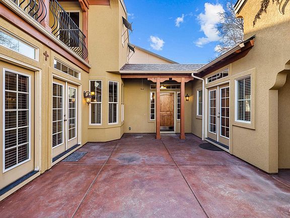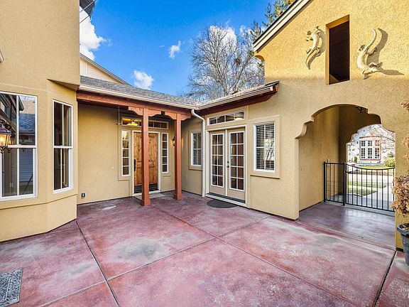 You'll love this gorgeous, low maintenance home with courtyard in Eagle! It is located in a darling small community off of Old State Street (low traffic area). This peaceful neighborhood has its own little park. Enjoy the winter evenings next to the fireplace, the summer days in the beautiful shaded courtyard, or some sun in the side yard. With over 2400 sq. ft. and 3 car garage, you will have plenty of room. The spacious master bedroom has a den and balcony, and the lower level has a full bath right next to another large bedroom, making it ideal for a multigenerational or roommate situation. The third bedroom has beautiful french doors and walk in closet. Extra storage above garage with ladder.