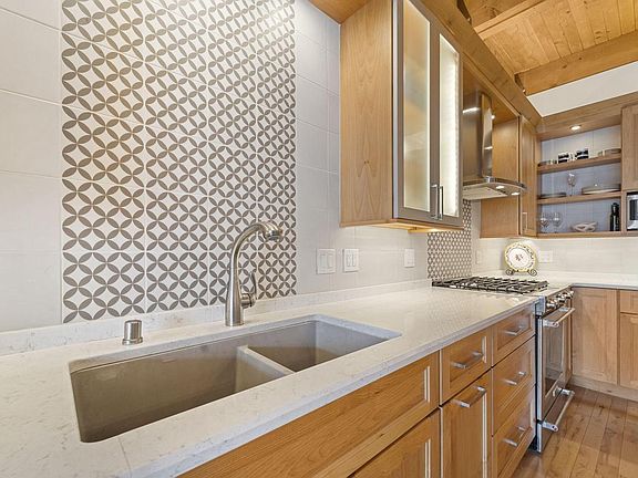 Modern cabinetryStylish light fixturesQuartz countersFully renovated kitchenCustom tile backsplashEnsuite bathExposed wood beam ceilings