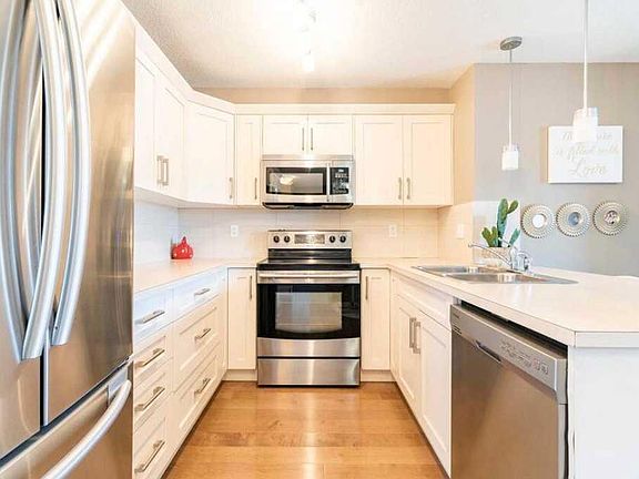 Welcome to this beautifully refreshed 2 BED, 2 BATH condo, featuring fresh paint and luxurious new high-end carpeting in the bedrooms. With over 800 SQ FT. Step inside to discover stunning hardwood floors in the main living areas and a stylish eating bar illuminated by elegant upgraded pendant lighting. The gourmet kitchen is a chef's dream, complete with soft-closing cabinet drawers, an upgraded tiled backsplash, and top-of-the-line stainless steel Samsung appliances. This home is packed with thoughtful upgrades, including modern lighting, ceiling fans, blinds, carpet and hardwood. Enjoy outdoor living with a gas line for your BBQ on the balcony. You'll also appreciate the spacious in-suite laundry with front-loading washer and dryer, plus additional built-in storage. For your convenience, this condo offers secure underground heated parking (titled) and your own storage locker. Located in a well maintained and desirable Panorama West condo complex. The area is loaded with amenities. You'll find yourself within walking distance to playgrounds, parks, schools, shops, grocery stores, and excellent dining options. With easy access to Stoney Trail, Deerfoot, the airport, and public transportation, this condo is perfectly situated. Don’t miss out on this amazing opportunity—call today to schedule a viewing! And be sure to check out the virtual tour as well.