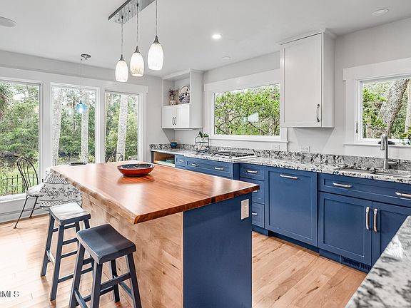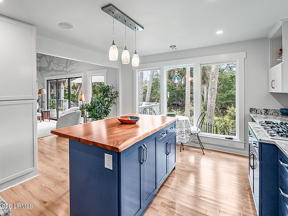 Waterfront home with panoramic views! A spacious, coastal retreat designed for both relaxation and entertainment, featuring a gourmet kitchen and multiple gathering areas. This beautiful, fully renovated lakefront home offers the perfect blend. Nestled at the end of a quiet cul-de-sac, it overlooks Blue Heron Lake—an ideal setting for birdwatchers and nature lovers. From herons and kingfishers to painted buntings and mergansers, enjoy the beauty of the rookery from the screened porch, sunny deck, or open living areas.
